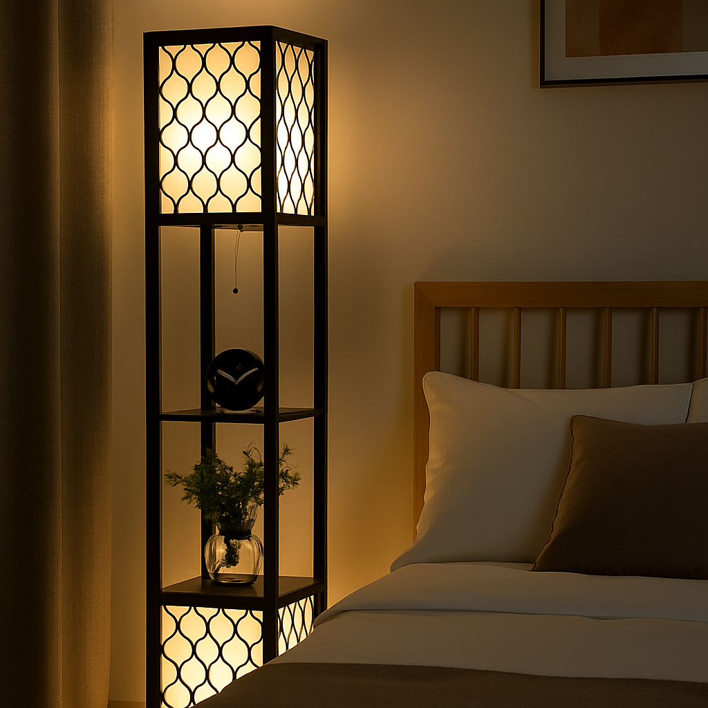 Découvrez ce lampadaire colonne moderne, pensé pour allier éclairage chaleureux et espace de rangement pratique. Grâce à ses deux écrans lumineux et ses étagères intégrées, il crée une ambiance douce tout en offrant un espace élégant pour exposer vos plantes, livres, cadres photo ou objets décoratifs.