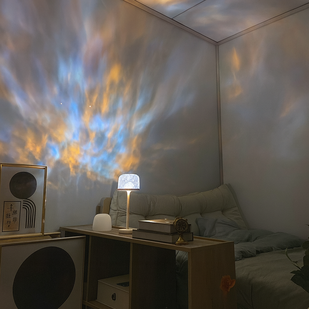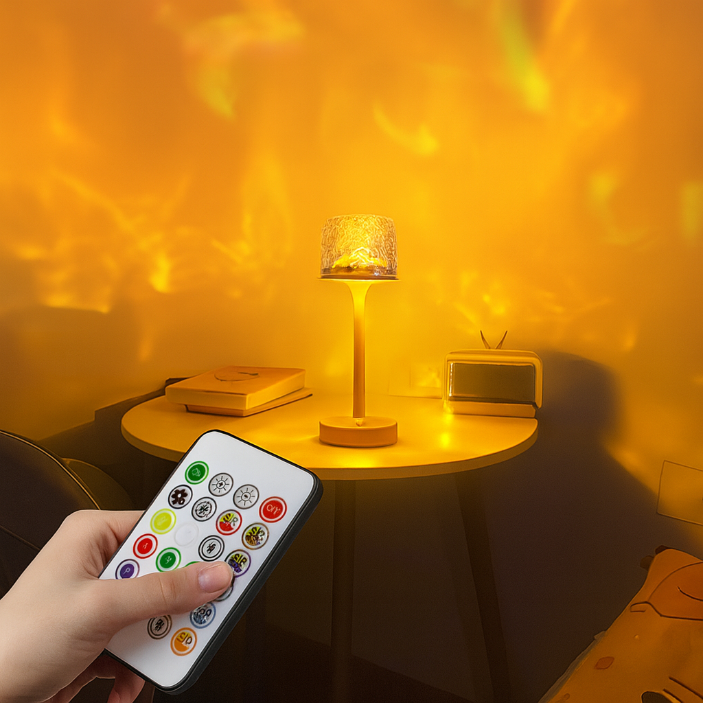 Son abat-jour diffuse une lumière douce et homogène, tandis que sa projection façon effet ondulation d’eau donne un rendu visuel apaisant et immersif.