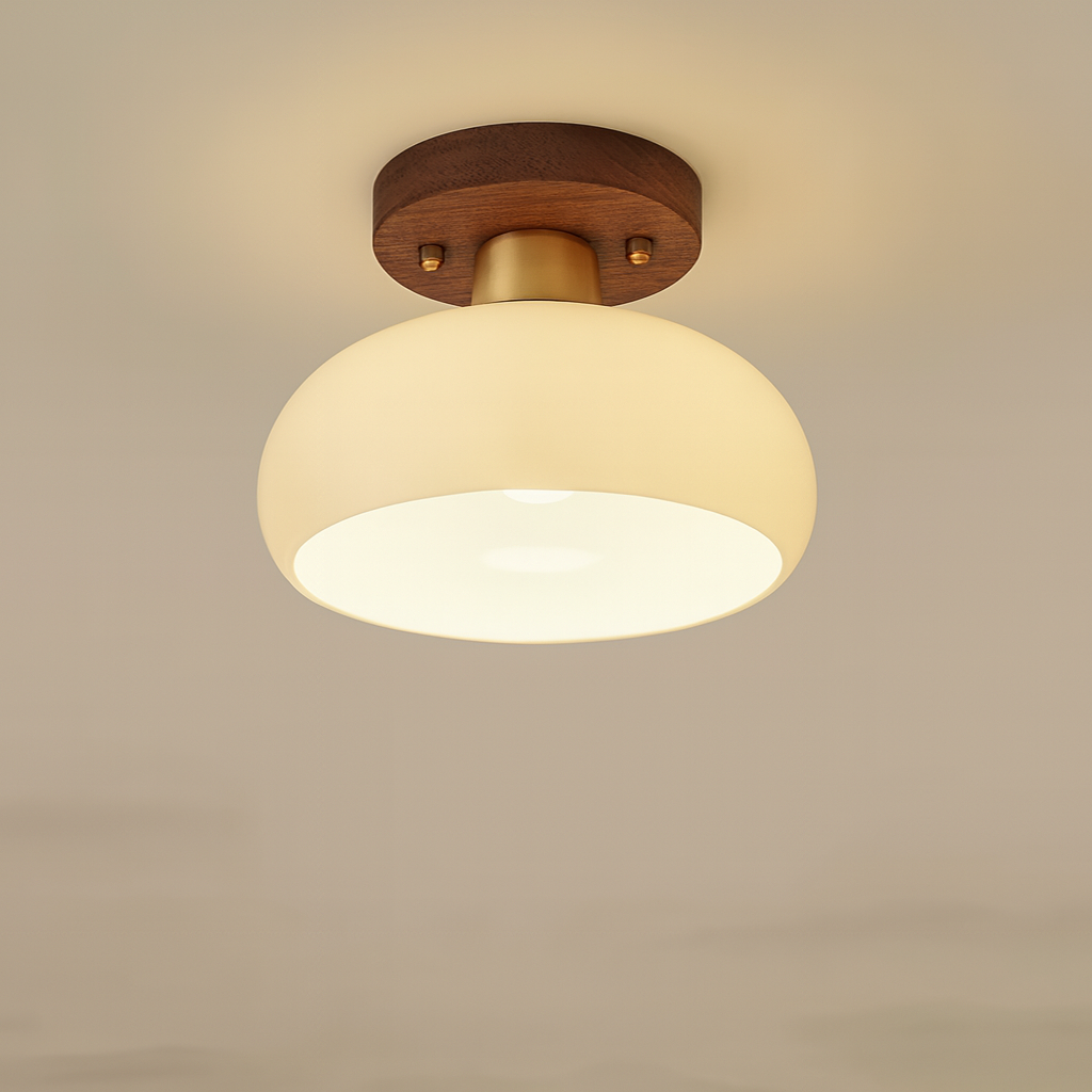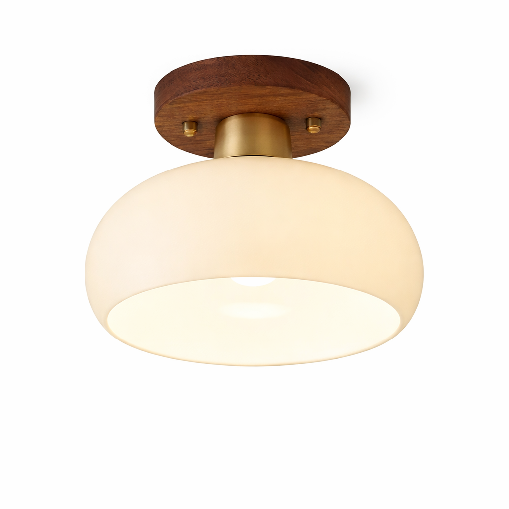 L’association du bois naturel, du laiton doré et du verre lumineux donne à ce plafonnier un charme authentique et haut de gamme.